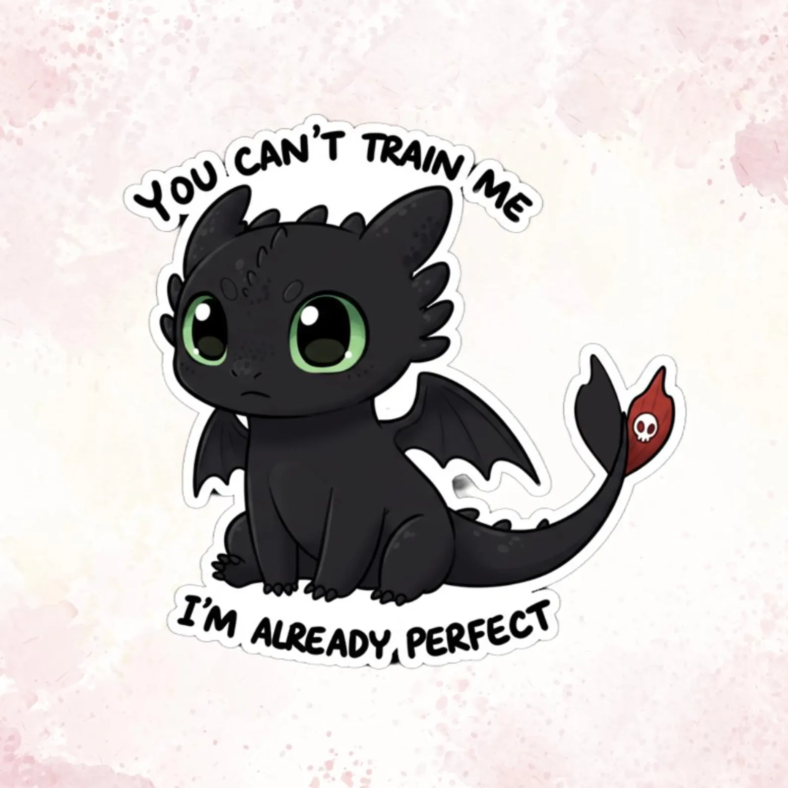 This adorable Toothless sticker features your favorite Night Fury from How to Train Your Dragon with the bold quote: “You Can’t Train Me, I’m Already Perfect”! Made from high-quality waterproof vinyl, it’s perfect for decorating laptops, water bottles, notebooks, and more. Durable, weatherproof, and super cute – a must-have for dragon lovers and HTTYD fans!